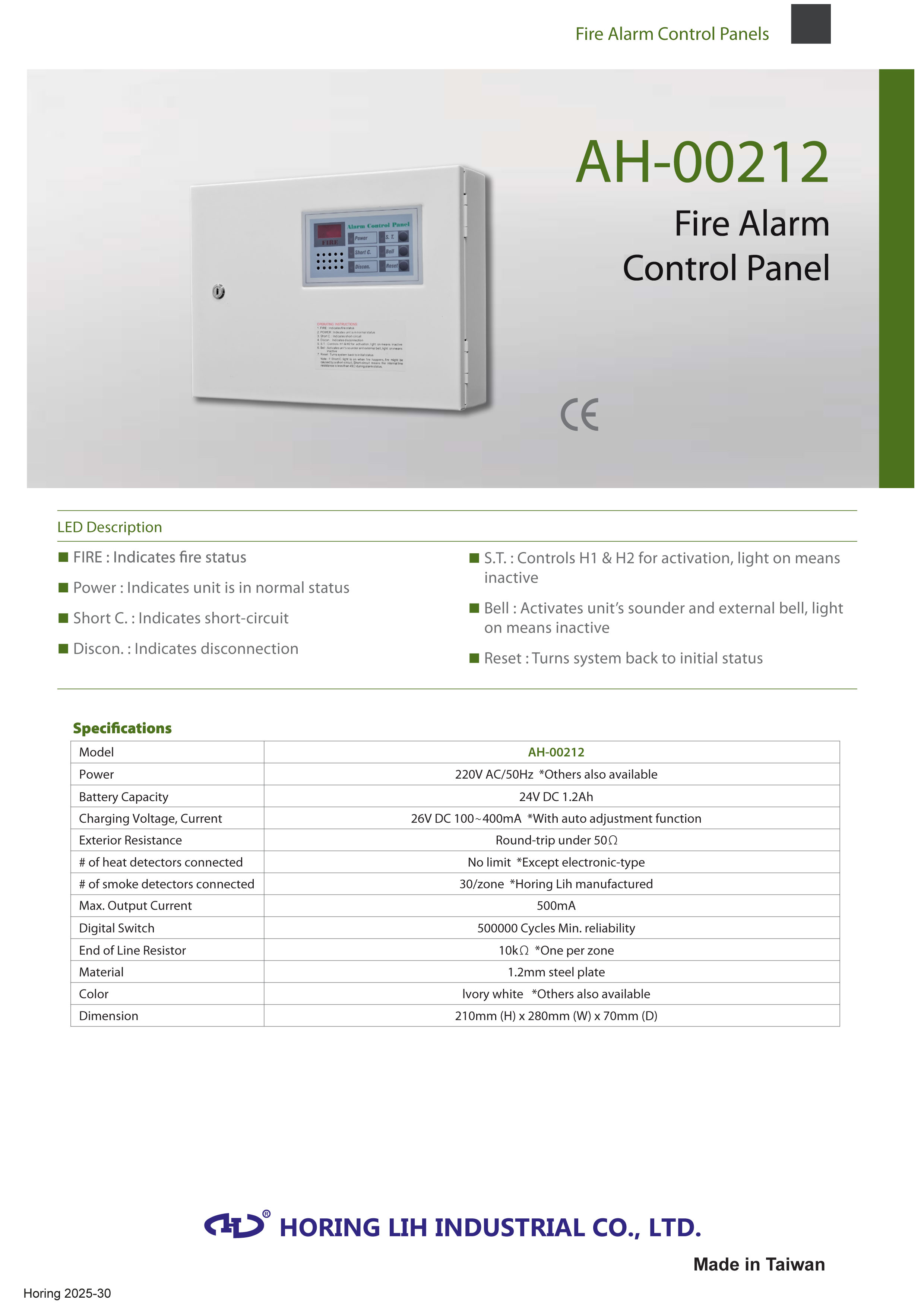 ตู้ควบคุมระบบแจ้งเตือนเพลิงไหม้ ขนาด 1 โซน รุ่น AH-00212 ยี่ห้อ Horing Lih